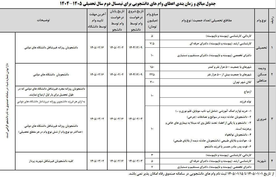 جدول مبالغ و زمانبندی وام های دانشجویی نیمسال دوم سال تحصیلی ۱۴۰۵-۱۴۰۴