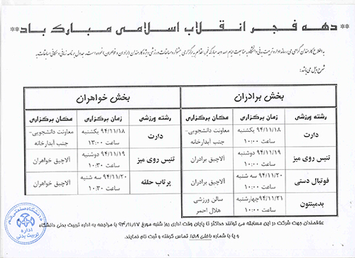اطلاعیه برگزاری مسابقات ورزشی ویژه دهه مبارک فجر