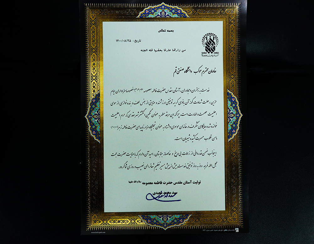 با توجه به برگزاری موکب هیئت های دانشگاه صنعتی به مناسبت رحلت حضرت فاطمه معصومه سلام الله علیها به دلیل خدمت رسانی شایسته به زائرین و مجاورین حرم مطهر و همچنین فرهنگ سازی دینی و معنوی در بین جوانان، تولیت آستان مقدس حضرت معصومه سلام الله علیها با اهدای لوح تقدیر از خادمین این موکب تقدیر و تشکر به عمل آورد.