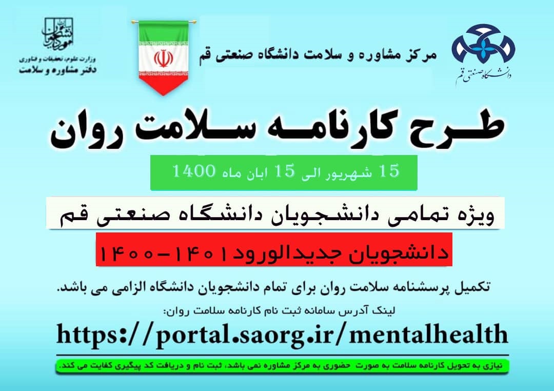باتوجه به آغاز سال تحصیلی و با توجه به لزوم اجرای طرح پایش سلامت، کلیه دانشجویان محترم می بایست با مراجعه به آدرسhttps://portal.saorg.ir/mentalhealth نسبت به تکمیل پرسشنامه کارنامه سلامت روان اقدام نمایند.