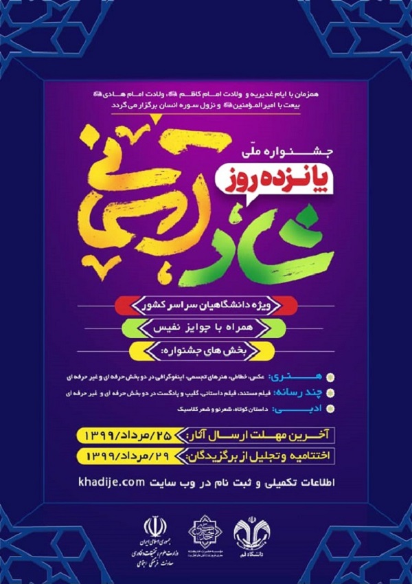 به گزارش روابط عمومی دانشگاه این جشنواره همزمان با اعیاد فرخنده وبا فضیلت قربان وغدیر خم برگزار می گردد.وبه عناوین برگزیده جوائز ارزنده ای اهداء خواهد شد .