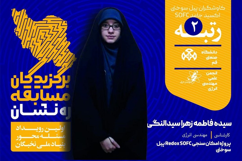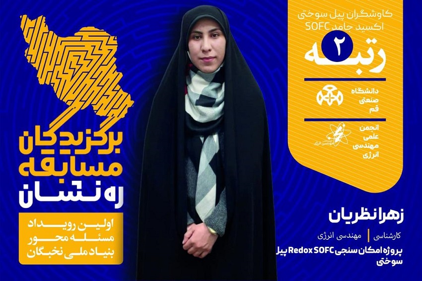 کسب رتبه دوم توسط سرکار خانم زهرا نظریان دانشجوی کارشناسی مهندسی انرژی در پروژه امکان سنجی Redox_SOFC پیل سوختی در حوزه انرژی