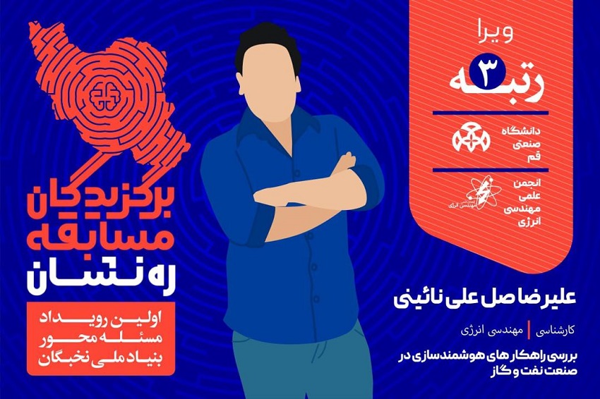 کسب رتبه سوم توسط جناب آفای علیرضا صل علی نائینی دانشجوی کارشناسی مهندسی انرژی در پروژه بررسی راهکار های هوشمندسازی در صنعت نفت و گاز در حوزه هوشمندسازی
