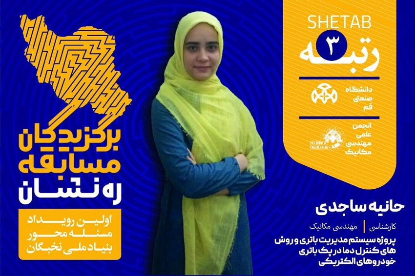 کسب رتبه سوم توسط سرکارخانم حانیه ساجدی دانشجو کارشناسی مهندسی مکانیک پروژه سیستم مدیریت باتری و روشهای کنترل دما در پک باتری خودروهای در حوزه انرژی