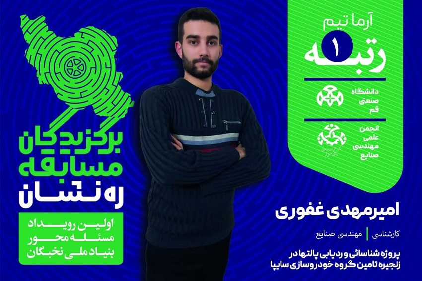 کسب رتبه اول توسط جناب آقای امیرمهدی غفوری دانشجو کارشناسی مهندسی صنایع پروژه شناسائی و ردیابی پالتها در زنجیره تامین گروه خودروسازی سایپا در حوزه حمل و نقل
