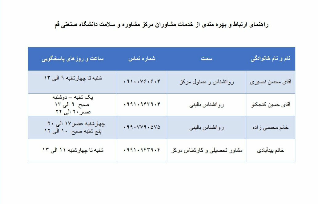 راهنمای ارتباط وبهره مندی از خدمات مشاوران مرکز مشاوره و سلامت دانشگاه صنعتی قم