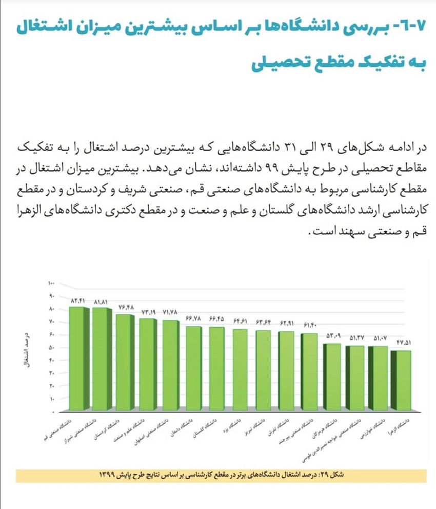 شایان ذکر است در این بررسی دانشگاه صنعتی قم با 82/41 درصد رتبه اول میزان اشتغال در مقطع کارشناسی طرح پایش سال 1399 را به خود اختصاص داده است.