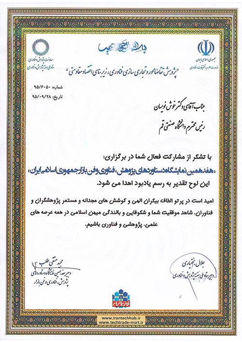 شرکت دانشگاه صنعتی قم در هفدهمین نمایشگاه دستاوردهای پژوهش ، فناوری وفن بازار جمهوری اسلامی ایران و تجلیل از ریاست محترم دانشگاه