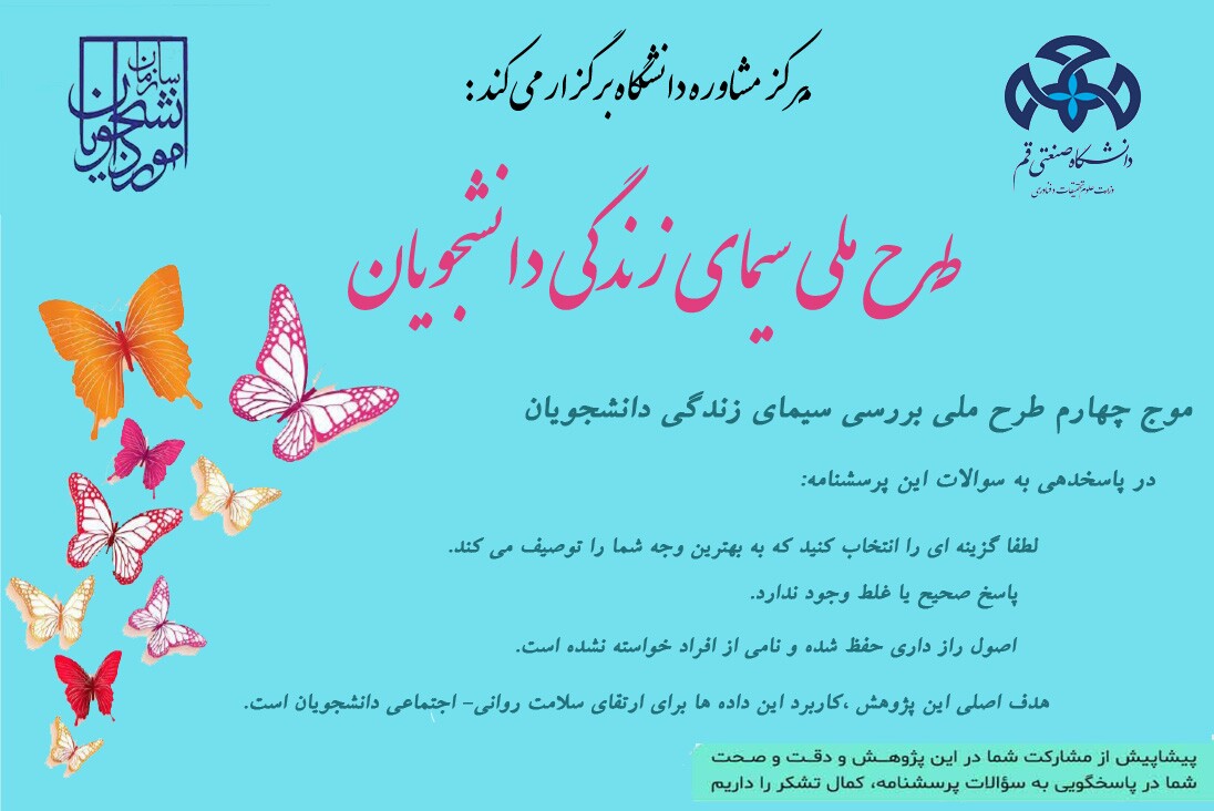 📢 مرکز مشاوره و سلامت دانشگاه از همه دانشجویان عزیز و گرامی در تمامی مقاطع جهت شرکت در "طرح ملی سیمای زندگی دانشجویان" دعوت می نماید.