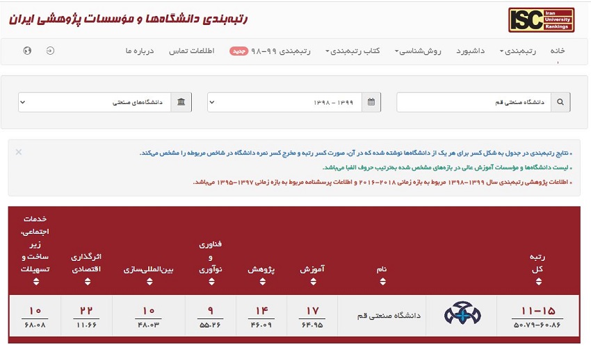 به گزارش روابط عمومی دانشگاه این پایگاه همه ساله بر اساس 6 معیار آموزش، پژوهش، فناوری و نوآوری، بین المللی سازی، اثرگذاری اقتصادی و زیرساختها دانشگاه های مختلف کشور را مورد ارزیابی و رتبه بندی قرار می دهد که مورد تایید و ملاک عمل وزارت علوم، تحقیقات و فناوری نیز می باشد. دانشگاه صنعتی قم در سال گذشته در رتبه 21 تا 30 دانشگاه های صنعتی کشور قرار گرفته بود که با توجه به برنامه ریزیهای صورت گرفته در جهت اعتلای رتبه دانشگاه، در رتبه بندی سال 1399، دانشگاه رشد چشمگیری را داشته وتوانست در رتبه 11 تا 15 این رتبه بندی قرار گیرد. در جدول زیر رتبه دانشگاه در معیارهای مذکور و در سالهای مختلف، نشان از عملکرد مثبت دانشگاه در اغلب زمینه ها دارد.