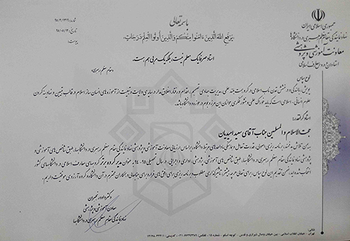 به یمن تلاش هدفمند، برنامه ریزی اصولی، قدرت تعامل و هماهنگی با واحدهای مرتبط دانشگاه بر اساس ارزیابی معاونت آموزشی و پژوهشی نهاد نمایندگی مقام معظم رهبری در دانشگاه ها، طبق شاخص آموزشی و پژوهشی نهاد نمایندگی مقام معظم رهبری در دانشگاه ها در سال تحصیلی 95-94 به عنوان مدیر گروه برتر گروه های معارف اسلامی در دانشگاه های کشور انتخاب شده اید.