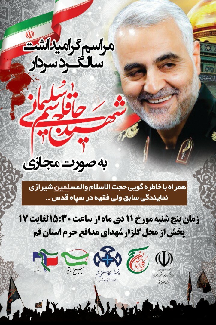 ویژه برنامه دهه بصیرت و سالگرد شهادت سپهبد حاج قاسم سلیمانی به صورت مجازی از گلزار شهدای مدافع حرم استان به همت دانشگاه صنعتی قم برگزار می گردد.